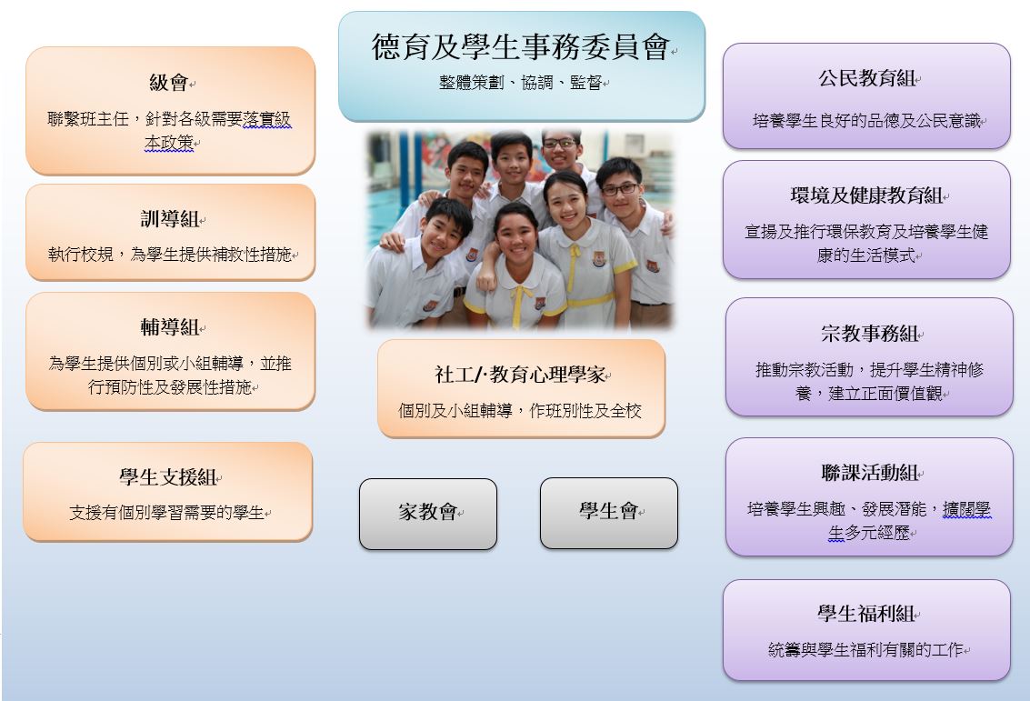 學生的成長,有不同的發展階段,各階段各有不同的需要;因應社會環境的變動,校本文化的差異,各校的情況亦可能有「差之毫釐」之別。我們相信,要提供優質的學生成長支援服務,必先對學生的心性發展與需要有所了解。本校對品德教育向所重視,由德育及學生事務委員會推動有關工作。德育及學生事務委員會以副校長為首,帶領成員包括訓導組、輔導組、人生規劃組、宗教事務組、級會、公民教育組、課外活動組、環境及健康教育組、生活教育組、學生支援組及學生福利組等,配合駐校社工,教育心理學家為學生提供不同類型的成長支援服務。各轄屬科組每年推展多元化的活動,並以培養學生的價值觀和態度,促進學生之全人發展為基要考慮,為學生提供不同的價值教育元素,涵蓋德育、公民教育、環境教育、性教育和健康教育等範疇。